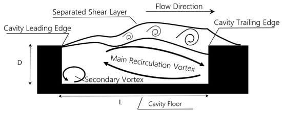 A typical flow topology within a shallow open cavity at low speeds is illustrated in Figure 1. Due to momentum transfer, the cavity separated shear layer expands as it develops downstream. Eventually, it impinges on the cavity trailing edge. As a result, a portion of the separated shear layer flow deflects back towards the cavity leading edge, forming a large recirculation vortex inside the cavity (main recirculation vortex). Driven by the main recirculation vortex, a weaker recirculation vortex (secondary vortex) is usually formed near the cavity leading edge [6].