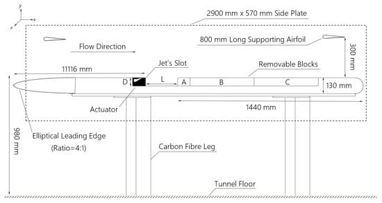The actuator was positioned at the cavity leading edge and fastened to the model by bolts screwed from underneath the model. To reduce manufacturing costs and air supply requirements, the actuator covers only the central portion of the cavity span. The actuator consists of an actuator housing, removable plastic insert, perforated tube, top plate, air chamber, a mesh, nozzle, knife edge, and jet outlet. The jet outlet is positioned at the cavity leading edge. The jet outlet is 1.85 mm wide and 400 mm long. The air-tight actuator housing, which was made of aluminium, is 65 mm high, 100 mm wide, and 420 mm long. The plastic inserts were made using a 3D printer and then surface-smoothed with sandpaper. Three design elements were added to the actuator to ensure a uniform jet along the span of the slot: (i) perforated tube to provide a uniform air supply, (ii) a chamber where the air mixes, and (iii) a mesh downstream of the air chamber to increase the pressure in the chamber, which enhances the mixing. Within the mid-span region of the jet (), the velocity variation is approximately 5%.
