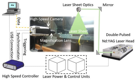 A two-dimensional particle image velocimetry system (PIV), shown in Figure 3, was used to study the cavity velocity field. The laser beam is emitted from a dual-pulsed Litron Nd:YAG laser head, with a repetition rate of 200 Hz and wavelength of 532 nm. The laser head consists of two laser resonators, each emitting a laser beam. The laser beam is guided via a number of fixed mirrors into the laser sheet optics at the top of the test section, where the beam is expanded by a cylindrical lens into a thin laser sheet, which illuminates the mid-span of the cavity. PIV raw images are captured using a Phantom V341 digital high-speed video camera, placed perpendicular to the laser sheet. The camera is fitted with a 105 mm Sigma lens and equipped with CMOS sensor, which has a full resolution of 2560 × 1600 pixel at a frame rate of 10 to 800 frames/second. The camera was triggered and synchronised with the laser pulses by a high-speed controller.
