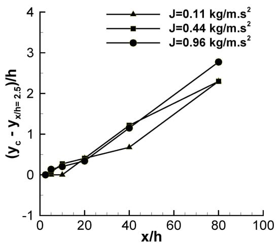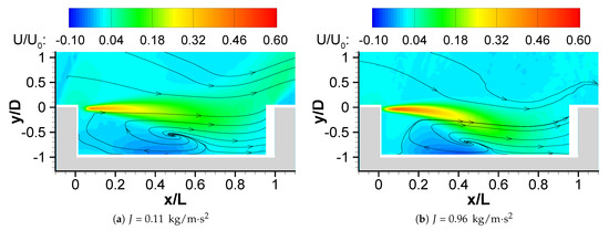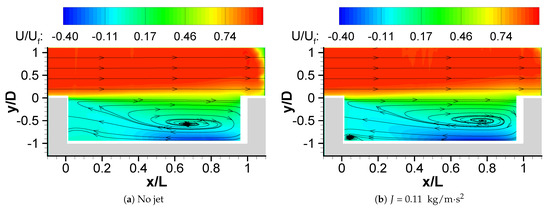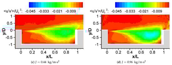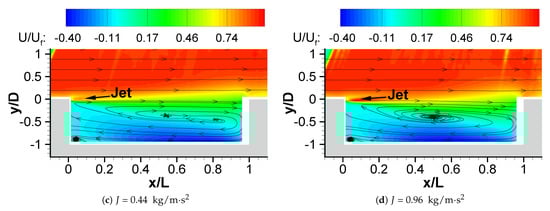 Figure 10 shows the time-averaged along the centre of the main recirculation vortex. As J increases, the jet impingement at the cavity trailing edge increases the return flow velocity and pushes the main recirculation vortex upstream. As a result, more return flow impacts the cavity leading edge region. However, increasing J from kg/m·s to kg/m·s does not produce a significant increase in the amount of the return flow impacting the cavity leading edge.