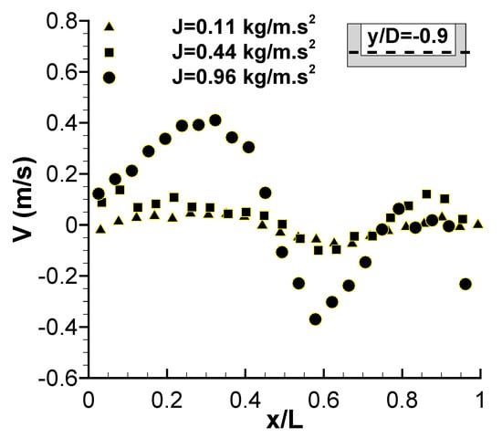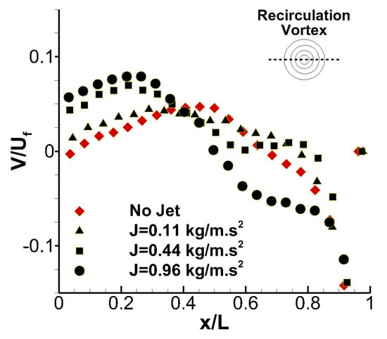 The jet deflection towards the cavity floor at J = 0.96 kg/m·s is attributed to the coanda effect. As the characteristic jet velocity (or J) increases, the jet entrains more fluid from the cavity [31]. As a result, the static pressure at the cavity floor decreases, until it reaches a threshold value. Beyond this point, the pressure force causes the jet to deflect towards the cavity floor. Figure 6 shows the time-averaged V velocity distribution along the cavity floor () for different J values. The positive V velocity indicates upward fluid movement or jet entrainment, while the negative V velocity indicates a downward fluid movement. The jet entrainment at J = 0.11 kg/m·s and J = 0.44 kg/m·s is quite small. Increasing J to 0.96 kg/m·s yields a significant increase in the entrainment at the upstream half (), which forces the jet to deflect downwards. As the jet deflects and reattaches onto the cavity floor, the sign of V shifts from positive to negative. In summary, the jet is parallel to the x-axis. However, installing the jet in the cavity model causes it to deflect downwards towards the cavity floor due to the coanda effect. If this effect persists in the dynamic conditions (wind tunnel is on), jet deflection will increase the cavity return flow instead of reducing it.