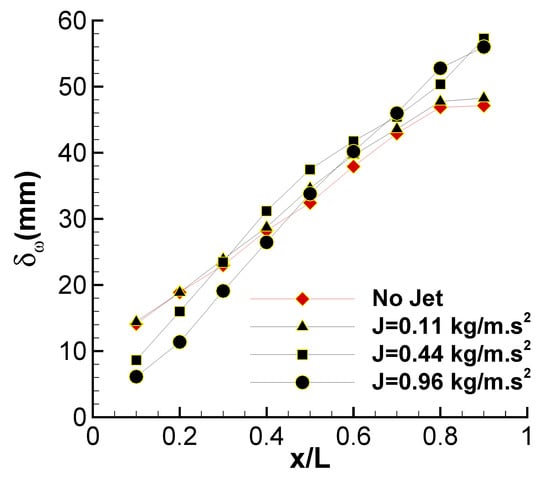 The experiments were carried out at free stream velocity of 11.1 m/s, which corresponds to 50,000 and . The upstream boundary layer was fully turbulent. For the jet-on cases, the jet’s bulk Reynolds number (), momentum flux per unit width (J), and momentum coefficient () are shown in Table 1. The jet momentum flux per unit width J is