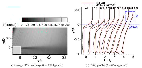To further investigate the jet impact on the separated shear layer, Figure 9 shows the time-averaged PIV raw images and profiles at different axial stations for different values of J. To show the profiles clearly, they are separated by equal margins along the x-axis of the plot. At kg/m·s, the jet completely mixes with the cavity flow near the cavity leading edge and hence has almost no influence on the velocity profiles downstream, as illustrated in Figure 9a. However, at kg/m·s, the jet penetrates the cavity separated shear layer. As the jet expands downstream, the velocity difference decreases until the two profiles collapse into one profile at . At kg/m·s, the penetration effect is stronger, as shown in Figure 9d. Even at kg/m·s, the figure does not show any downward deflection in the cavity separated shear layer, which was observed previously in Figure 5 for the quiescent condition due to the coanda effect. However, at this J value, the lower side of the jet grows faster than the upper side. The difference in the jet’s growth rate between the two halves of the jet is because the upper side of the jet is in contact with the relatively fast-moving free stream, while the lower side of the jet is in contact with the relatively slow-moving cavity flow. As a result, the jet’s growth rate on the lower side is larger than that of the upper side. This is because the strongly advected side of the jet (the upper side) has difficulty in entraining the free stream fluid into the jet, as the jet momentum at this side of the jet is relatively small compared to the momentum of the free stream, and vice versa for the weakly advected side of the jet (the lower side) [32]. This is consistent with reported studies on jet interaction in a co-flowing free stream, such as the studies of Ben Haj Ayech et al. [33] and Kalifa et al. [34]. It is also important to note that the jet causes a reduction in the streamwise velocity near the cavity trailing edge (region “C”), as demonstrated in Figure 9d. This reduction is attributed to the increase of the upward V velocity at the cavity trailing edge, which impedes the flow of the shear layer and increases the thickness of the the cavity separated shear layer.
