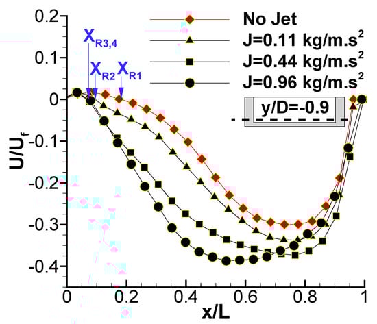 The increase in the return flow velocity causes the separation point to move towards the cavity leading edge. Figure 11 shows the distribution of along the cavity floor (). The streamwise locations , , and denote the separation point for the no-jet, kg/m·s, and kg/m·s cases, respectively. The results show that for kg/m·s, the separation point is displaced upstream from to . Increasing J to kg/m·s slightly shifts the separation point to . There is almost no change in the position of the separation point between kg/m·s and kg/m·s cases.