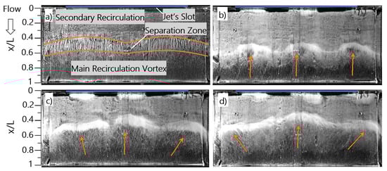 The small difference in the return flow rate and position of the separation point between the kg/m·s and kg/m·s cases is attributed to the divergence of the return flow. Figure 12 shows the images of the surface oil flow visualisations for the no-jet and jet-on cases. The images are for the central portion on the cavity. The blue line at the cavity leading edge indicates the slot. At kg/m·s, the return flow is parallel to the x-axis, as evident from Figure 12b. As J increases, the return flow starts to diverge towards the side walls. This divergence increases with J, as illustrated in Figure 12c,d. This divergence is attributed to the impingement of the jets at the cavity trailing edge. This impingement raises the stagnation pressure at the mid-span of the cavity compared to the side regions, where the jet is not applied. As a result, the return flow diverges towards the side regions of the cavity. Despite this flow divergence, the return flow at the mid-span region remains parallel to the x-axis, and hence, the flow at this region, where the PIV and pressure measurements are acquired, is likely to be two-dimensional.