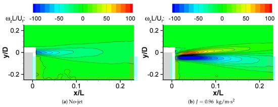 Figure 13 also shows that the turbulence broadband level increases with J. This is due to the relatively small-scale disturbances generated by the jet, which are responsible for the rise in the turbulence fluctuation. The increase in the turbulence fluctuation is also evident by the increase in the Reynolds shear stresses. Figure 14 shows the dimensionless time-averaged Reynolds shear stress for the no-jet (baseline) and jet-on cases. As illustrated in the figure, increasing J yields a substantial increase in the Reynolds shear stress in the shear layer. Figure 15 shows the time-averaged vorticity of the shear layer with no-jet and with jet ( kg/m·s). The presence of the jet generates two regions of narrow thickness and high vorticity. These opposite-vorticity regions are generated due to the higher velocity at the jet centre compared to the velocity at the jet boundaries. In these two regions, small-scale counter-rotating vortical structures are continuously shed due to Kelvin–Helmholtz instability [39]. Although these small-scale structures might have a short life-span, they increase the fluctuation level and affect the large coherent vortical structures in the cavity separated shear layer.