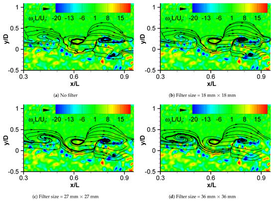 In order to study the impact of the jet on the large coherent vortical structures, these structures are further examined. To reveal these structures in the cavity separated shear layer, the fluctuating velocity flow fields were generated. The fluctuating velocity flow fields were produced by subtracting the instantaneous flow fields from the time-averaged field. Afterwards, a spatial filter with a Gaussian kernel was used to filter out small structures, and hence it generates a clearer visualisation of the large coherent structures. Figure 16a shows the unfiltered fluctuating velocity field. Two large vortical structures appear: one centred at ( 0.4, 0.3) and the other centred at ( 0.8, 0.2). Applying the spatial filter with a Gaussian kernel size of 18 mm × 18 mm (Figure 16b) provides a clearer visualisation of vortical structures. Increasing the filter size to 27 mm × 27 mm (Figure 16c) enhances the clarity of the large vortical structures further. A further increase in the kernel size (Figure 16d) filters out some flow details without improving the clarity of the large vortical structures. Thus, it was decided to implement the spatial filter with a Gaussian kernel size of 27 mm × 27 mm. Using this method, 400 sequential images were examined to count the large coherent vortical structures passing over the cavity trailing edge.