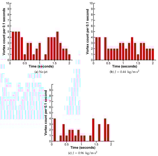 Figure 17 shows the vortex count of the large coherent vortical structures passing over the cavity trailing edge for . As illustrated in the figure, increasing the jet’s momentum flux makes the formation of large coherent vortical structures more intermittent. This suppression effect is probably because the jet supplies the cavity with relatively small-scale disturbances. As J increases, the jet populates the separated shear layer with these small-scale disturbances, which impede the formation of the large coherent vortical structures. A similar finding was reported by Smith and Glezer [40], who examined the interaction between a conventional rectangular (primary) air jet and a co-flowing synthetic jet at a Reynolds number based on the exit jet velocity of 300–440. In their study, the spectrum analysis showed that the Kelvin–Helmholtz (K-H) instabilities (which lead to the formation of the vortical structures in the separated layer) were suppressed particularly in the jet–jet interaction region, as the large vortical structures were replaced by small-scale disturbances.