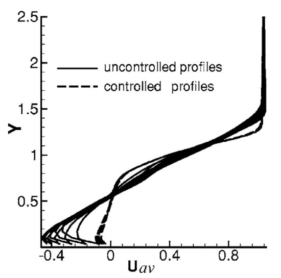 Although the momentum coefficient in the current study (between 0.57% and 5.04%) significantly exceeds the threshold value of found by Suponitsky et al. [25], , steady blowing from the cavity leading edge does not yield any noticeable improvements in the stability of the cavity separated shear layer. According to Suponitsky et al. [25], the effectiveness of this control method is linked to the suppression of the cavity return flow velocity. To investigate this further, the dimensionless streamwise velocity profiles from the current study (Figure 9d) are compared with the velocity profiles from the simulation of Suponitsky et al. [25] in Figure 18. Figure 9d shows the velocity profiles along the cavity length, while Figure 18 shows the profiles in the last quarter of the cavity for flow controlled by the injection and suction. According to Suponitsky et al. [25], suction at the cavity trailing edge does not have a significant effect of on the cavity flow field, but it provides a mass source for the jet injection. Therefore, it can be assumed that Figure 18 also represents the controlled case by injection from the cavity leading edge. As illustrated in Figure 9d, adding the jet in the current study increases the thickness and streamwise velocity of the cavity separated shear layer, especially at the lower portion of the cavity separated shear layer (below ). As a result, the return flow velocity increases. In contrast, Figure 18 illustrates that the jet in Suponitsky et al.’s [25] work reduced the thickness of the cavity separated shear layer. The jet also reduced the streamwise velocity at the lower portion of the cavity separated shear layer (below ). This is the justification for the reduction in the cavity return flow velocity in the study of Suponitsky et al. [25], though the authors did not provide a detailed justification for this reduction.