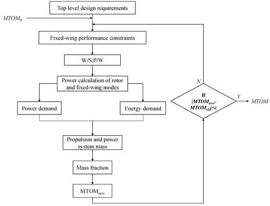 The initial sizing method is an iterative process, as showed in Figure 3. According to the top-level design requirements and a given . First, select the optimal design point by analyzing the performance constraints of fixed-wing mode. Thus, the P/W and W/S are obtained. Then, calculating the power demand of the flight process. The mass of propulsion and power system is obtained through the power-mass relationship of propulsion and power system components while the energy mass can be calculated with a given mission profile. The new is calculated through the empirical mass proportion as the next input value until the absolute difference between the two adjacent iteration results is allowed, the design process is completed.