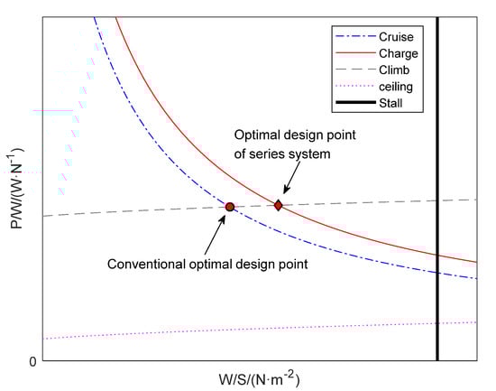 The diagram also features the optimal design point, which requires the least power or thrust to meet all applicable requirements. This point results in minimum power required and this usually means a power plant that is less expensive to acquire and operate [21]. The red dot is the design point of all electric propulsion system, turbine electric propulsion system, and parallel propulsion system. Since the series hybrid system needs to charge the battery in the cruise phase, the design point is the intersection of the charging constraint and the climbing constraint, which is the red diamond point.