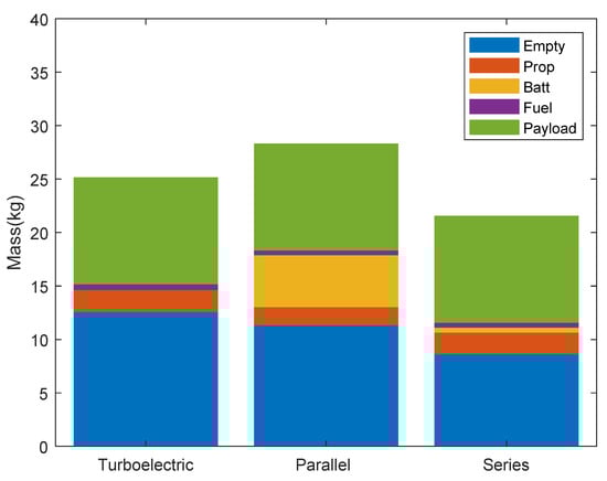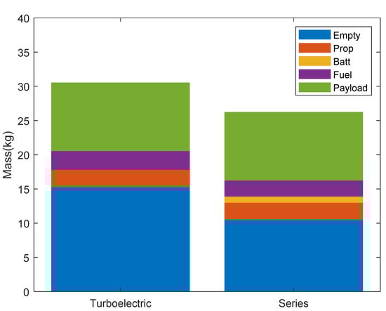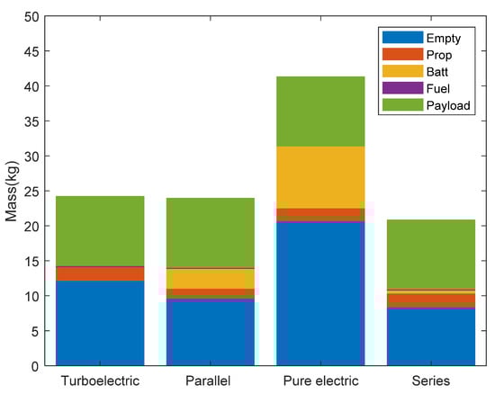 In case 3, only turboelectric and series hybrid-electric UAV can meet the requirements. As shown in Figure 7, compared with turboelectric UAV, series hybrid-electric UAV has the best performance in MTOM and fuel consumption. The MTOM was 26.34 kg and 30.54 kg, respectively, and the fuel consumption was 2.34 kg and 2.73 kg, respectively.