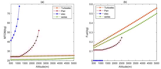 The effect of takeoff altitude on MTOM and fuel consumption are shown in Figure 8. For MTOM, takeoff altitude has the greatest effect on all electric UAV and parallel hybrid-electric UAV, but has relatively little effect on turboelectric UAV and series hybrid-electric UAV. Moreover, the maximum takeoff altitude of all electric UAV is minimum, only 1100 m, followed by parallel hybrid-electric UAV, which maximum takeoff altitude is 2500 m. Both turboelectric and series hybrid-electric UAV exceed 5000 m, of which series hybrid-electric UAV holds the minimum MTOM.