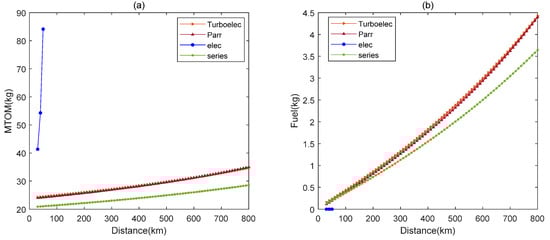 Effect of cruise distance: (a) MTOM; (b) fuel consumption.