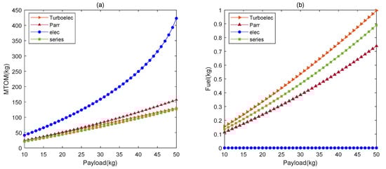 Effect of payload: (a) MTOM; (b) fuel consumption.