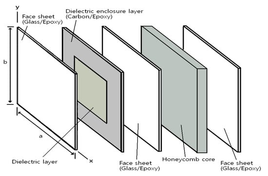 The model consists of five layers. In addition, the width, length and thickness are b, a and h, respectively. From the left part of the model, the staking sequences are the face sheet, the dielectric layer with a dielectric enclosure, a face sheet, the honeycomb core and another face sheet. The face sheets can protect the dielectric components from various external loads. This model is an asymmetric multi-layered structure. Therefore, the total displacement of the model can be calculated as the summation of the displacement for shear deformation of the core and the displacement due to bending of the model. Additionally, the honeycomb core transmits shear between the sheets, and conducts it as an air gap.