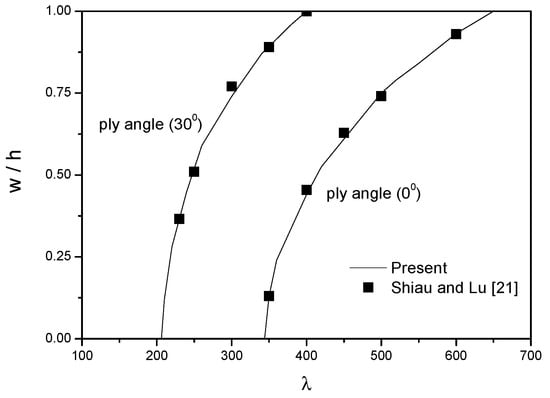 To verify the simulations, three cases were performed. Firstly, Figure 2 presents the plots of natural frequencies for two ply angles (0 and 45) according to the relative sizes of the dielectric part (dielectric region/total area of dielectric layer). Then, the natural frequencies decrease as the dielectric portions increase, and the numerical results show good agreements with the data in Ref. [].