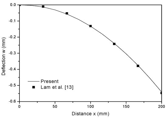 Finally, Figure 4 depicts the deflection behaviors of a cantilevered plate. The linear static analysis of the model with the upper layer and lower surface with piezoelectric materials placed on them. The input voltage is chosen as , and the stacking sequence of the model is [−45/45/−45/45]. The material properties for graphite/epoxy and PZT used in this case are presented in Table 2. The numerical result also shows good agreement with the data in Ref. [].