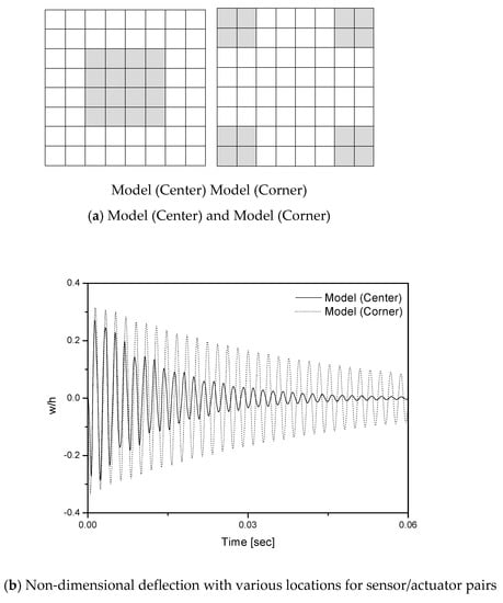 Generally, the dielectric portion as an antenna function is located at the center of the smart-skin antenna structure []. The dielectric layer is an essential part of the smart skin with various shapes of the dielectric region such as a circular [], square [] and rectangular [] shapes. Thus, the pairs of piezoelectric sensors/actuators are not located in such a manner as to block the antenna elements, and the pairs should be used in patch-types instead of the layers. Prior to investigating the skin antenna structure, the honeycomb core model was studied with the distributed patches in order to obtain the effective control positions. Along with the results in Figure 5, Figure 6, Figure 7 and Figure 8, we thereby determined the optimal conditions of each of the pairs of sensors/actuators for control. First of all, in order to easily understand the effects of various parameters in each restricted situation, only the vibration characteristics were considered without considering the aerodynamic nonlinearity. After then, the suppression of the flutter behaviors was studied using control method considering aerodynamic nonlinearity []. Figure 5, Figure 6 and Figure 7 demonstrate the effectiveness of the vibration suppressions of the sandwich honeycomb core model. Due to the numerical results in the early stage of vibration, they showed a limit cycle of motion with little change in amplitude without control. In Figure 5, Figure 6 and Figure 7, the data show the effects with various parameters after the start of the control of the vibration motion. Figure 5 represents the effect of position for the patches on the responses of the model. As shown in Figure 5a, the patches are located in the center and corner positions of both the top and bottom surfaces of the panel, respectively. Figure 5b clearly shows that the vibration suppression efficiency is better as the piezoelectric materials are placed on the center portion of the structure. In other words, the performances of the patches are more efficient when they are closer to the center of the model.