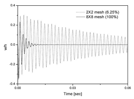 Next, Figure 3 shows the limit-cycle oscillation (LCO) amplitudes of the model to verify the time integration process. Newmark’s method is used as 0.1 ms for the time step. Additionally, the deflection is the transverse deformation at x/a = 3/4 and y/b = 1/2 for maximum magnitude of the LCO. The numerical simulations show good agreement with the numerical data [].