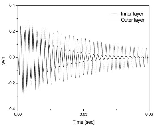 Figure 7 shows the effect of positions for piezoelectric materials for the inner layer and outer layer. In the two cases, the piezolayers are placed at the nearest and farthest points from the midplane, respectively. As the layers move farther from the midplane, the more quickly they are suppressed. This is due to the maximum moment generated by the layer, which occurs when the layers are placed farthest from the midplane. That is, the surface-bonded case presents more efficient control because the largest moment arm can be obtained with respect to the midplane.