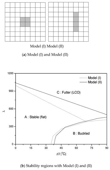 Now, the flutter suppressions of the structure are studied under supersonic flow. Generally, the typical panel LCO shape is different when exposed to the motion caused by vibration. Due to the aerodynamic flow, the peak point of deflections is moved backwards, and then the maximum panel deflection occurs at the point of 3/4 of the length [,]. In this regard, Figure 8a shows that the patches are placed at the center, as shown in Model (I). However, the patches are placed at the 3/4 point, as shown in Model (II). Figure 8b presents the stable regions of the panels with various placements of the patches. Upon comparing the areas of stable regions of the two types, we find that the stability conditions of the Model (II) are better than those of Model (I) because the patch of Model (II) is placed near the peak amplitude for the model; thus, the performance of the patch is more effective, and similar results are presented in Ref. [].