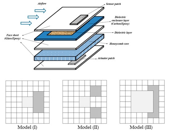 Figure 9 shows the skin antenna models with piezoelectric sensor and actuator patches in supersonic airflow. In addition, three models were presented according to the size of the dielectric layer and the location of the patches. The center area indicates the dielectric antenna part, and the piezoelectric patches are located next to the part. To have the greatest possible effect on flutter control, the patches are placed at top and bottom layers and at 3/4 position from the airflow. As previously stated, the quantity of smart materials is limited in real time; thus, the patches are chosen as same area. In this regard, Figure 10a,b show flutter suppression via thermal and aerodynamic effects, respectively. Active control is started after 0.05 s to compare the controlled responses with the uncontrolled responses.