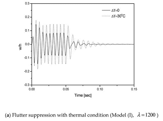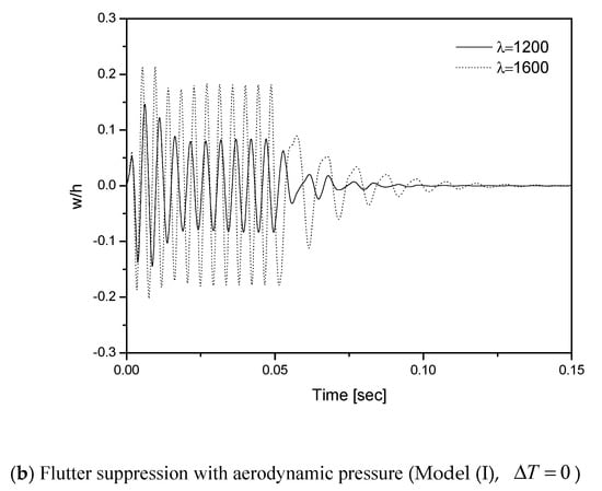 Firstly, the thermal variation () is selected as 0 and 30, and the aerodynamic load is chosen as in Figure 10a. The result shows that the flutter motion of the model can be suppressed faster in low temperature conditions. On the other hand, the pressures () in Figure 10b are chosen as 1200 and 1600 without considering thermal effect. In this case, flutter suppression is more difficult with high pressure loads. It can be seen that the oscillation of the structure is reduced more quickly with low temperature and aerodynamic pressure. Additionally, the results of the bold lines are dealt with in the same conditions as in both Figure 10a,b.