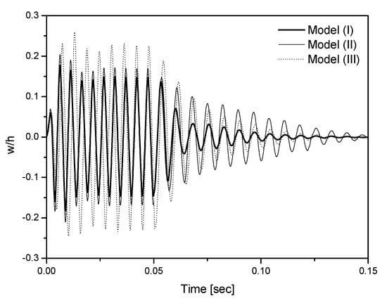 Finally, Figure 11 describes the flutter suppression motions of the structures based on piezoelectric patches. The control is also started after 0.05 s. In this case, the model (III) oscillated with high amplitude due to the flexibility of large antenna portion located at the center. Model (I) requires less suppression time compared to the other models. The results show that Model (I) is the most efficient for active flutter control because the piezoelectric materials for the Model (I) are the mostly widely displaced of the flutter suppression motions. It is very important to increase the portion of antenna components for the good radiofrequency radiation as an antenna structure. In addition, the patches are placed so as not to block the antenna parts, which means that the patches could be placed in a suboptimal position. It could degrade the performance of the sensor/actuator pairs. Ensuring the optimal conditions of the patches and the positions of the piezoelectric sensor and actuator are important for the antenna’s performance.