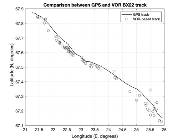 The comparison between the GPS ground track and the generated coordinates is displayed in Figure 1. A plot of the error (i.e., the distance between the GPS data and the COTS radio VOR-based position estimate, in km) is presented in Figure 2, while a visualization of the ground track reconstruction in Google Earth is displayed in Figure 3.