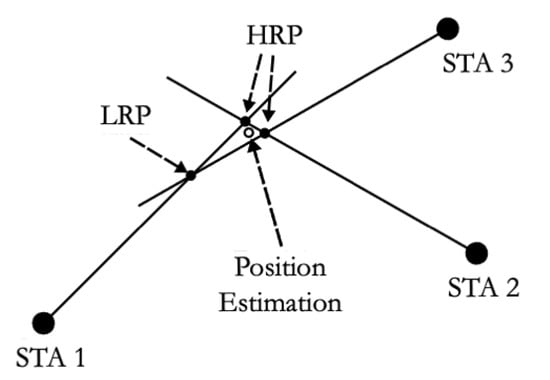 As such, different weights can be given to the intersection of different radials in a weighted average calculation for the position estimation. Shown in Figure 4 is an example of the estimation with three VOR stations present. Two High Reliability Points (HRP) are present, while the combination of Station 1 and Station 3, which are almost at 180 degrees from each other, form a Low Reliability Point (LRP); in fact, a small error in the radial of STA1 or STA3 will cause a great movement of the LRP point. The final position estimation is the weighted average of the three points, with the LRP having a low weight.