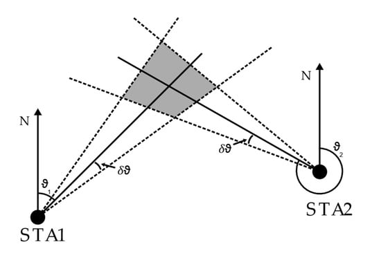 The weight of each intersection is assigned based on the geometrical properties of the arrangement between the two stations. A small, fixed error of is assigned to each the radial reading as shown in Figure 5. The four intersection points define a quadrilateral whose area is used as a measurement quality of the main intersection point–the higher the area, the lower is the reliability and quality of the intersection. Using the area as a measurement of quality is useful for two main reasons: (1) the further the receiver is from the stations the bigger the area for a given radial, so that the reliability decreases with distance, and (2) an interception at low angle of incidence, i.e., with the radials close to parallel, will give an higher area and thus lower reliability. In fact, close-to-parallel radials provide little information on the position, as small errors on the radial translate to a considerable movement of the intersection point.