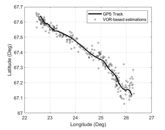 These navigation systems are generally not allowing the users to directly achieve positioning, while the absolute position determination is in general possible through further processing of the measurements. For example, the VOR system outputs the radial information, which equals the bearing angle of the line between the airborne receiver and the VOR ground station with respect to the Magnetic North, without any information on the actual position of the receiver []. If intersecting two radials, it is possible to calculate the latitude and longitude of the receiver.