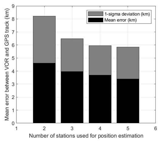 The importance of multiple stations can be seen in Figure 8 which shows the mean error and the standard deviation of positions estimations depending on the amount of stations that were used in the estimation process. The diminishing return effect is attributed to the fact that the VOR stations are spread out, and a higher number usually means that the additional stations are further away.