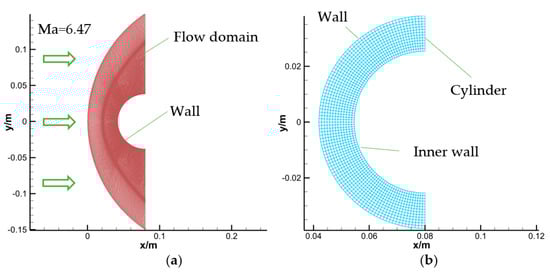 Because of symmetry, the model is reduced to two dimensions. Only one-half of the incoming flow domain and cylinder is modeled. In this paper, the finite-element model representing the flow domain and the cylinder is shown in Figure 3. The number of grids of fluid is 150 × 400. The number of grids of structure is 100 × 13. The grid near the wall of fluid is encrypted, and the minimum height is m. In order to better capture the characteristics of the flow field, the grid at the location of the shock wave is encrypted.