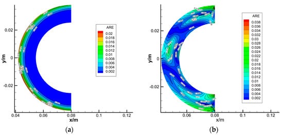 Relative error contour of the structural temperature and stress: (a) temperature; (b) stress.