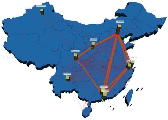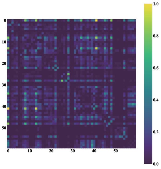 Due to the relatively small difference, the large flights flow in each city-pair can be used to approximately express the interactions strength of air traffic between airports. Therefore, we define the airport network as an undirected weighted graph. By Equation (12), the flow of flights is normalized into [0, 1], which is further regarded as the final weight value of the edge between nodes on the airport network. The graph presentation of the airport network is intuitively visualized in Figure 4. The brighter color indicates a large amount of air traffic according to the flight schedule, and the darker ones are small.