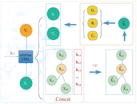 where the notation denotes the output at time instant , and are the update gate, reset gate at time instant t, respectively, and represent the learnable weights and deviations in the training process, and denotes the output at time instant t. Combining the GC block with the gated recurrent unit, the inference rules of the ATFPNet are shown in Equations (8)–(11).