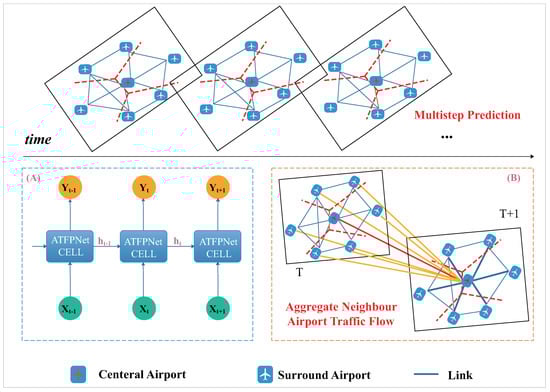 where the represents the graph convolution process and A represents the adjacent matrix. The other notations in Equations (8)–(11) are the same as those in Equations (4)–(7). At a given time instant, the dynamic patterns of the airport traffic flow sequence can be learned by the AFTPNet cell. By unrolling the ATFPNet cells, the proposed model can capture informative features to predict the arrival flow. The process of ATFPNet for multiple-step situational prediction is described in Figure 3. Subgraph A is an example that demonstrates the process of unrolling ATFPNet cells, like that of the GRU cells. Subgraph B shows that the ATFPNet captures the topological relationship between the neighbors and adjacent time instants.