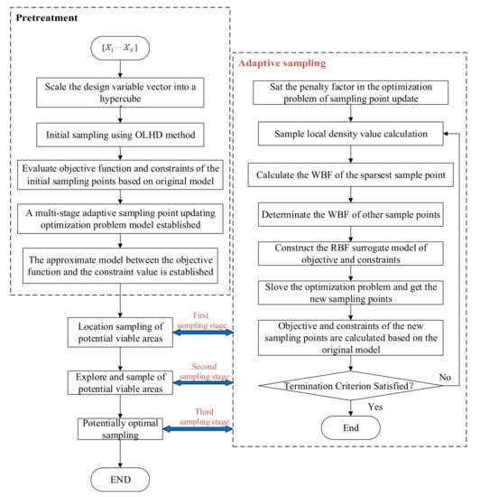 The multi-stage adaptive sampling points updating method proposed in this paper is based on the surrogate model and the sequence approximate optimization method, which can greatly improve the optimization efficiency of the optimization method under the premise of ensuring the probabilistic global optimum. The main steps are as follows: