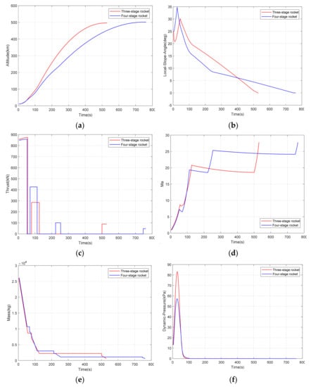 From the above comparative results of air-launched three-stage and four-stage solid rockets, it is clear that the four-stage rocket has stronger launch capability, but generally has a longer flight time and a more complex structure. To further compare the air-launched rocket for the improvement of the launch capacity, the four-stage rocket is selected for the optimization of the maximum launch capacity for ground vertical launch, and the results are as shown in Table 4 and Figure 5.