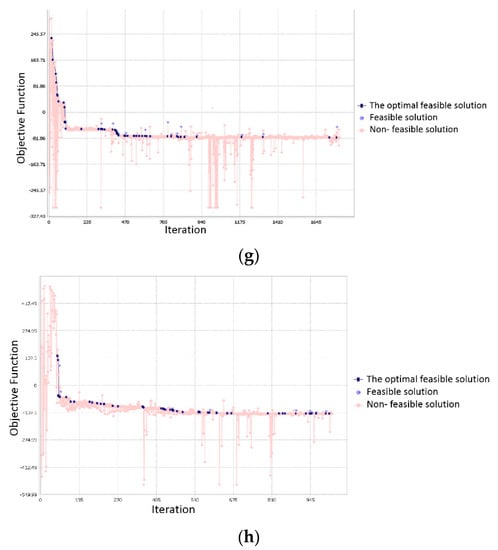 where, , and are the preset parameters required by the convergence criterion. The meaning of criterion I is that the current feasible solution is , which satisfies the inequality and equality constraints. Criterion II means the Euclidean distance between the current feasible solution and the recent sampling points is less than or equal to . Criterion III means the absolute value of error between the current sample points surrogate approximation model and its original function is less than or equal to .
