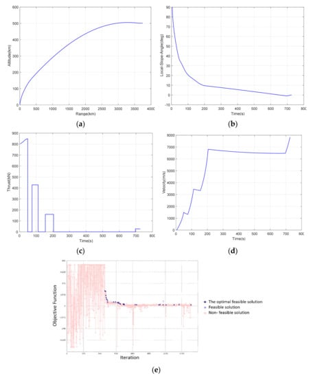 Optimization results for ground-launched rockets. (a) Range–height curve, (b) Time–local flight path angle curve, (c) Time–thrust curve, (d) Time–velocity number curve, (e) Convergence curve of the objective function.