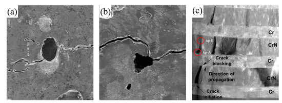 The research on additive and casting manufacturing will inevitably leave a defect in the workpiece. Defects, which include holes, pores, voids, inclusions, particles, pits, and impurities, could become initial fracture sites owing to their hazardous effect on the mechanical strength properties and fatigue strength. Based on experimentally obtained images, defects with different geometries such as circle [1], triangle [2], and arbitrary shape [3] are shown in Figure 1a, Figure 1b, and Figure 2a, respectively. Different defect geometry affects stress concentration and crack propagation differently. Many experiments obtained original results on the crack propagation mechanism. The multilayer coating system is observed wherein the crack existing in CrN would propagate to the next interface Cr/CrN [4] as shown in Figure 1c. For the casting process, pores should exist inside the workpiece. If a crack tip exists near pores subject to a mechanical loading, crack propagation is likely and would be directed toward the pores [2] as shown in Figure 1b. Manganese sulfide (MnS) inclusion would initiate crack evolution because the high interfacial stress around the boundary results in a decrease of the local fracture toughness and hastens the crack propagation [5].