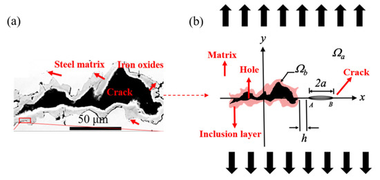 (a) Observation of macrostructure of hole, iron oxide, and steel matrix after the process of whole thermal treatment. Reprinted from Ref. [3]; (b) outlined photograph for illustrating the interaction between a line crack in the steel matrix and an irregular hole with inclusion layer under an in-plane remote uniform tensile loading.