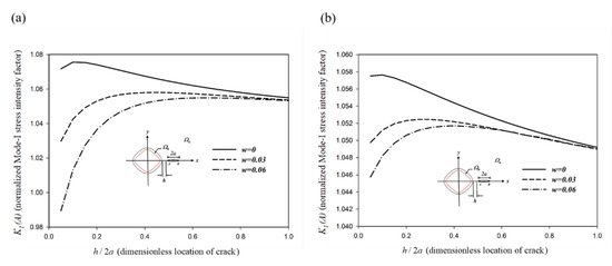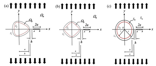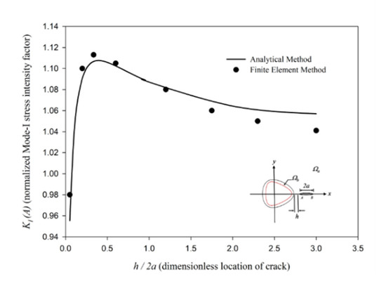 This study is aimed at investigating the failure behavior of a non-circular hole with an inclusion layer embedded in an infinite crack matrix under an in-plane remote uniform load. The SIF depends on the distance between a crack and the non-circular hole with an inclusion layer, material properties, and geometry of the non-circular hole. To prevent certain singular points in the continuity equations, the corrected terms, Equations (A6) and (A10), should be introduced. The contribution of these corrected terms is displayed in Figure 6.