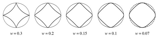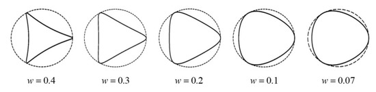 where is the shape factor. The integer represents the number of corners of a hole. For example, , , and for a triangle, square, and pentagon, respectively. The conformal mapping function can map an irregular hole with an inclusion layer in the -plane as shown in Figure 3a,b, onto two circles with a common origin. In addition, the inner and outer radii are unity and r, respectively, in the -plane (see Figure 3c). In the -plane, and represent the matrix and inclusion layer, respectively. represents the interface between these, and represents the interface between and a hole (see Figure 3c). The geometric configurations of an approximately triangular hole with an inclusion layer () and an approximately square hole with an inclusion layer () for different values of are shown in Figure 4 and Figure 5, respectively.