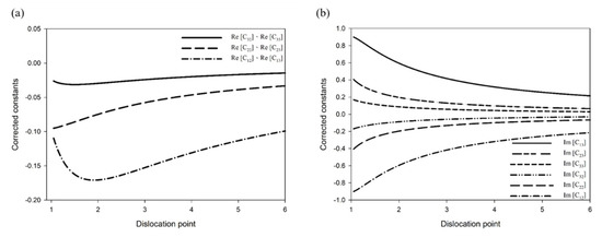 Note that the coefficient of the corrected term is a real number and those of the corrected terms and are two conjugate complex numbers. It is noteworthy that the coefficients gradually decrease to zero when the distance between the dislocation and the non-circular hole increases, as shown in Figure 6. Furthermore, the contribution of the corrected terms reduces with the increasing number of iterations, as shown in Table 1. According to this Table, the contribution of the corrected terms from the first to third iterations for a triangular hole problem is 72.7%, 18.7%, and 8.6%, respectively. The first two terms contribute >90%, which shows the rapid convergence of the proposed method.