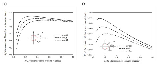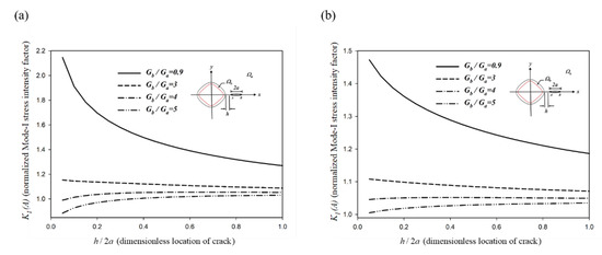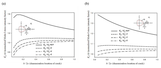 The dimensionless Mode-I SIFs at Tip A and Tip B versus the dimensionless h/2a with different material properties are shown in Figure 8.