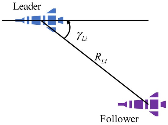 There are many types of missile formations, and there are different corresponding formations for different cooperative combat mission requirements. As shown in Figure 1 and Figure 2, three parameters are usually used to describe the formation of the leader and follower missiles in three-dimensional space. These parameters are the relative distance between the leader missile and the i-th follower missile, the relative altitude angle , and the relative azimuth . Accordingly, the formation of any group can be represented using these positional parameters for the follower missiles relative to the leader missile: